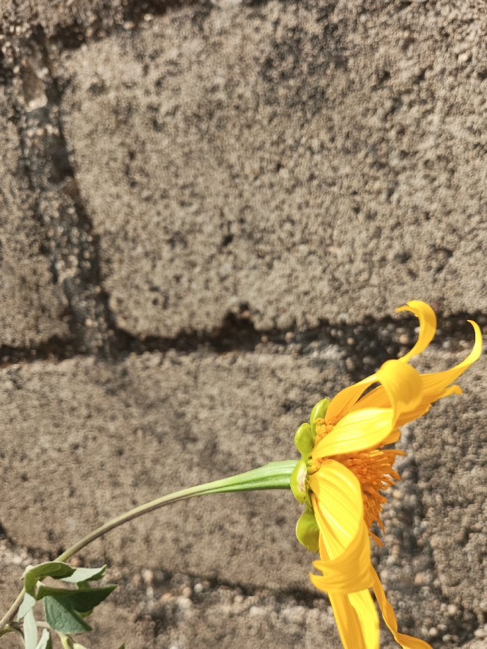 A single yellow flower is depicted in the foreground, positioned in the lower right of the frame and extending diagonally towards the lower left. The flower exhibits bright yellow petals, some curled upwards, and an orange-yellow center. A slender green stem extends from the flower, with a few light green leaves visible attached to the stem in the lower-left quadrant. The background consists of a textured, light gray-brown concrete wall, out of focus. The wall features a rough, granular surface and indistinct block-like divisions. A prominent dark horizontal shadow line is cast across the wall in the mid-ground. The scene is illuminated by direct sunlight. No individuals, additional subjects, or overt actions are present. The location is Katon Rikkos, Nigeria.
