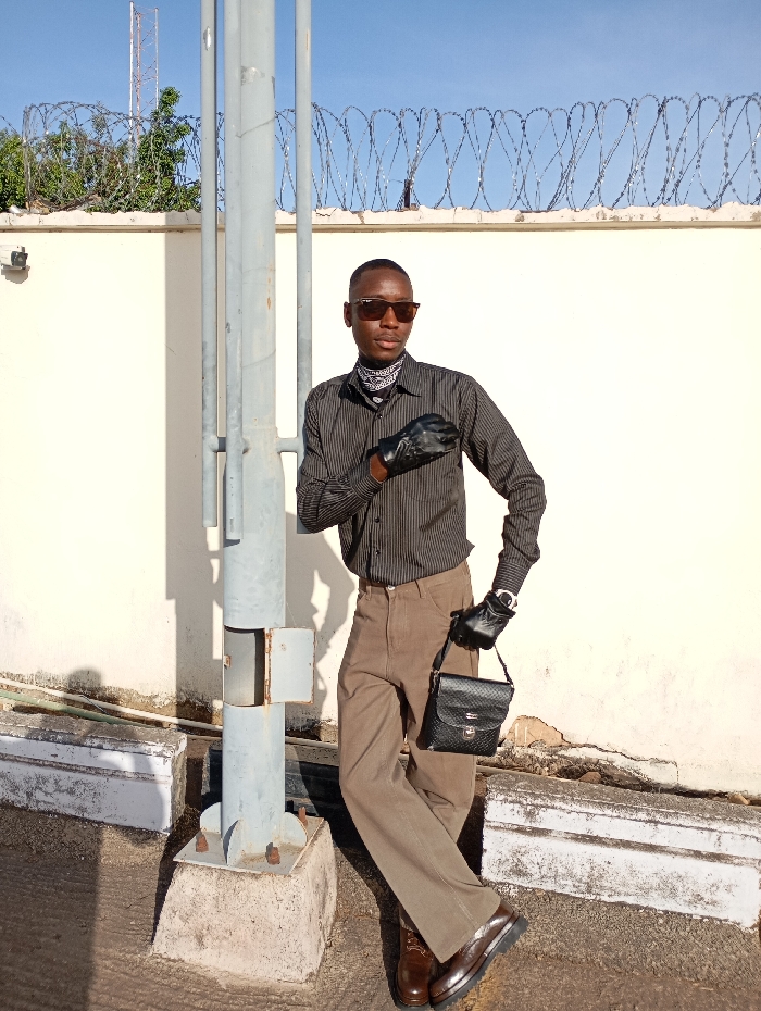 A person stands in front of a light-colored wall topped with barbed wire. The person wears a dark striped shirt, brown pants, and brown leather shoes, with black gloves and sunglasses. The person has a black patterned purse over their left shoulder and leans against a gray metal structure bolted to a concrete platform. The sky above is blue with light clouds.