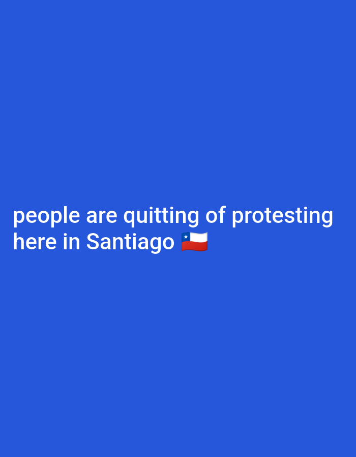 The image displays white sans-serif text centered against a solid royal blue background. The text reads: "people are quitting of protesting here in Santiago 🇨🇱". A Chilean flag emoji is rendered immediately following the word "Santiago". The information conveyed describes a general scene in Santiago, Chile, an urban area that includes the commune of Providencia. The identified subjects are an unspecified group of "people" engaged in the action of "quitting of protesting." No specific numbers of individuals, their appearances, any particular objects, explicit interactions, or detailed environmental features are visually depicted or textually conveyed beyond the general geographical reference to Santiago.