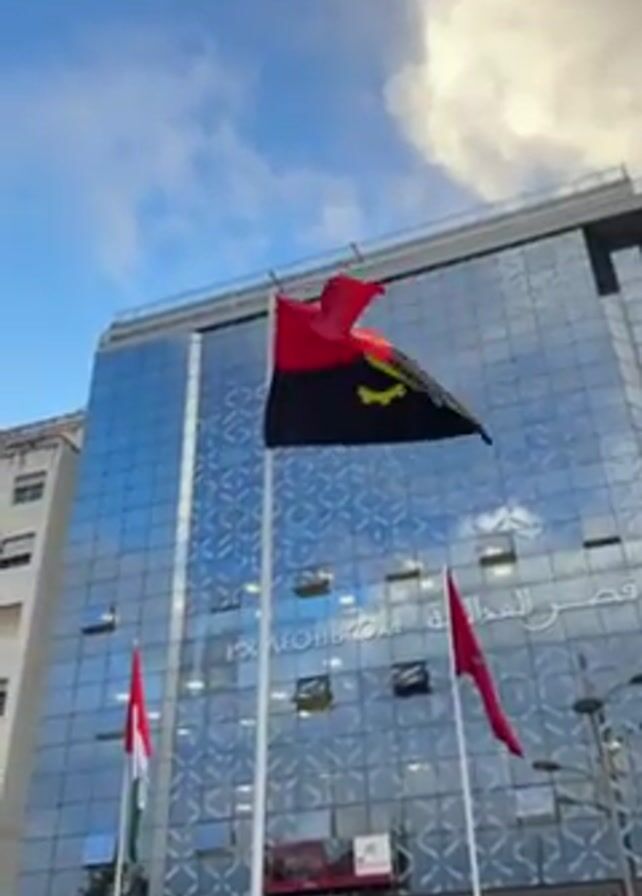 street scene with several national flags waving in the wind against a partly cloudy blue sky. The flags of Angola, Zambia, South Africa, and Zimbabwe are visible. The Angolan flag is in front of a modern glass building with Arabic writing. The other flags are on flagpoles along the street. The environment appears to be urban.
