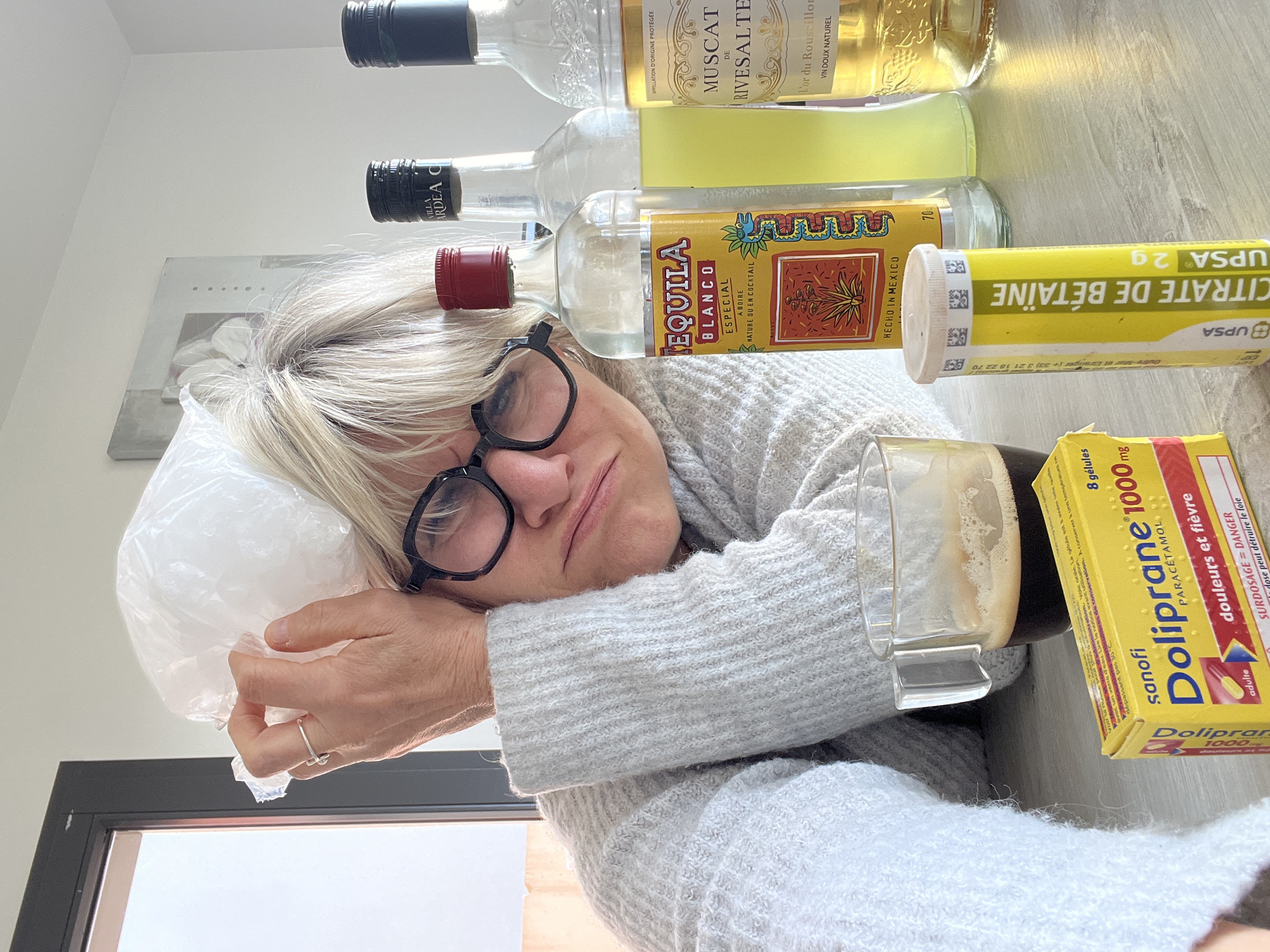 blonde woman with glasses lying on a light gray surface, with her head resting on a plastic bag filled with ice. She appears unwell and has a fatigued expression. Several items are arranged around her: Three bottles of alcohol (including one labeled "TEQUILA BLANCO" and one labeled "MUSCAT DE RIVESALTE"), a glass with a dark liquid, a yellow tube of "CITRATE DE BÉTAÏNE UPSA 2g," and a yellow box of "Doliprane 1000mg" (a paracetamol-based pain reliever). The setting appears to be indoors. A dark gray doorframe is visible in the lower left corner. There is no information in the image to connect it to the city of Chambœuf, France.