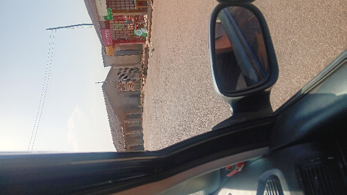 A street is viewed from inside a vehicle. The side mirror shows a reflection. Buildings line the roadside, adorned with various signs and posters. A utility pole stands along the side of the road, its lines stretching into the sky. The road appears paved. The vehicle's interior, including the dashboard and door, is visible, providing context for the outdoor view.