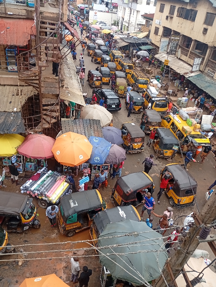 This elevated view depicts a bustling commercial street in Onitsha, Nigeria