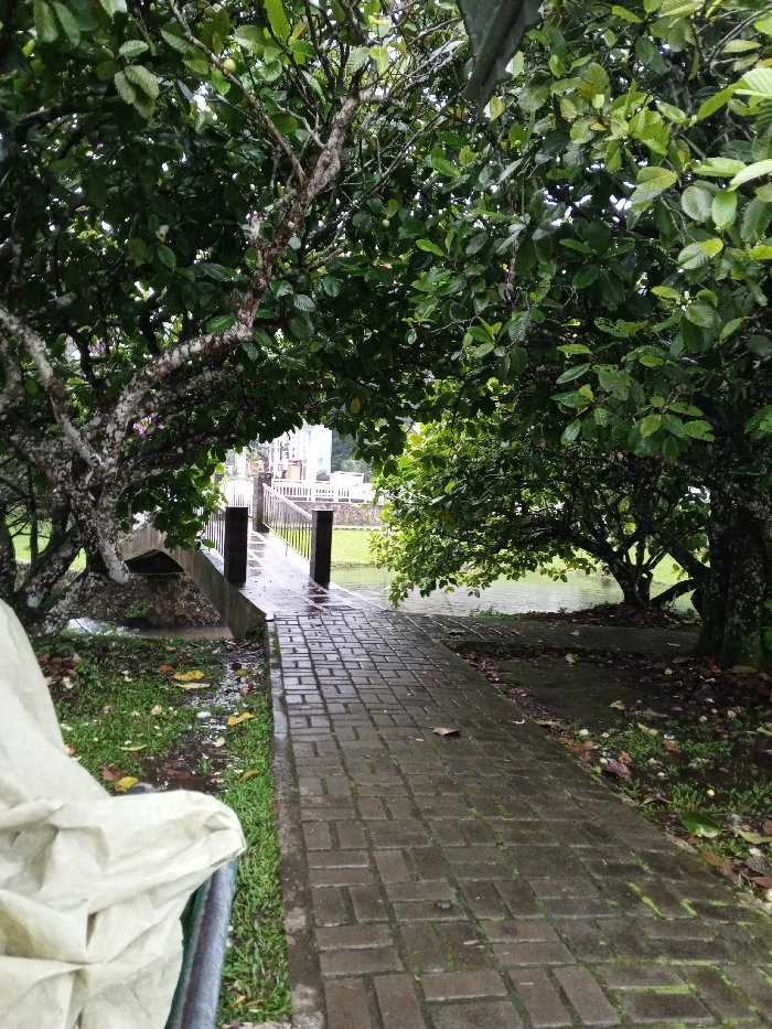 A brick path stretches towards a small bridge over water, flanked by lush green trees forming a canopy. The scene appears damp, with wet bricks and foliage suggesting recent rain. The trees have textured bark, and the branches are laden with leaves. In the distance, a building is faintly visible. The foreground features an object partially covered in white cloth.