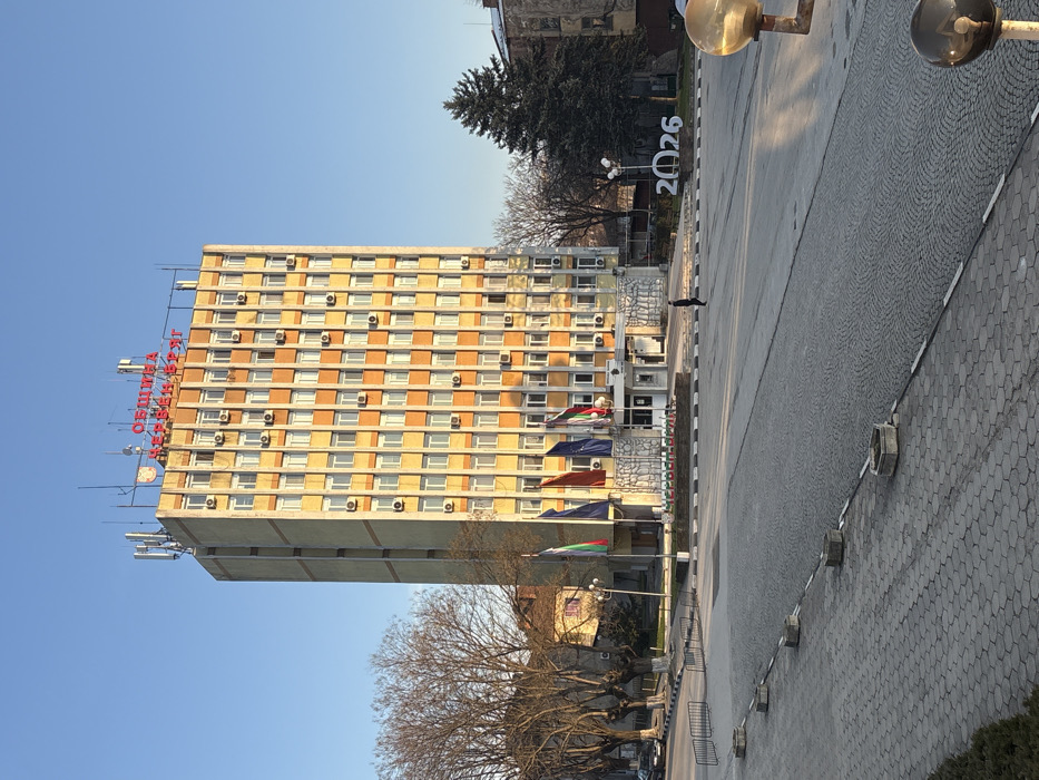 The image depicts the Municipal Administration building in Cherven Bryag, Bulgaria, on a clear day with a blue sky