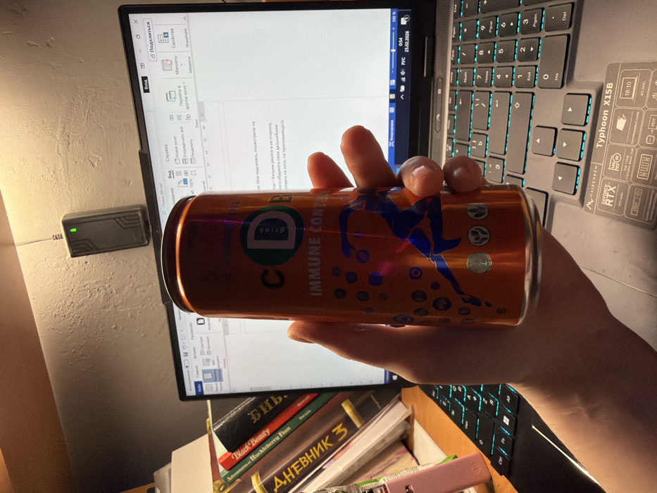 This forensic image captures an indoor desk scene, located in Lubnya, Russia. The primary subject is a human hand holding an orange beverage can. The can is metallic orange, featuring a prominent blue silhouette of a running figure, numerous small blue circles, and text including "C D drink" and "IMMUNE CONTROL." The hand grasps the can, with visible reflections on the fingers and fingernails. In the background, a grey MAIBENBEN Typhoon X15B laptop, specified with an NVIDIA GeForce RTX 4060, is open. Its keyboard exhibits cyan-blue backlighting. The laptop screen displays a document, likely in Microsoft Word, with visible Russian text. The Windows taskbar in the lower right corner shows the date "25.02.2026" and the time "0:54." To the left of the laptop, a stack of books is present, including titles in Russian such as "ДНЕВНИК" (Diary) and "Библ." (likely Bible), alongside English titles like "Black Beauty" and "Huckleberry Finn." A pink, slender object is partially visible near the books. Mounted on the light-colored wall above the laptop is a black, rectangular electronic device with a single illuminated green LED, suggesting active operation, possibly a network repeater or similar peripheral. The area is illuminated by an unseen warm light source, casting a glow on the wall and desk.