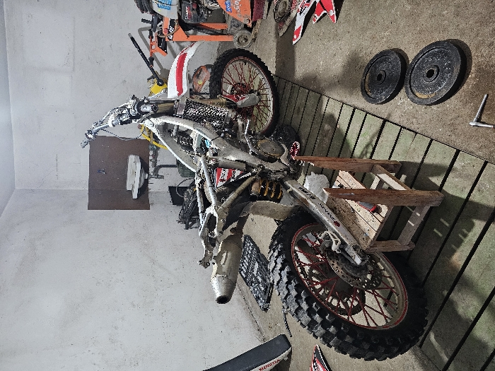 The image depicts a workshop or garage located in Vidin, Bulgaria. The central focus is a partially disassembled dirt bike, presented in a state of maintenance or repair. Its silver frame is exposed, lacking most of its plastic fairings except for a white front fender with a red accent. The bike features red-spoked wheels fitted with aggressive knobby tires suitable for off-road use. The rear wheel is elevated and supported by a rustic, two-tiered wooden stool positioned on the concrete floor. A metal exhaust pipe is visible extending from the left side of the bike's frame. The environment is utilitarian, characterized by light-colored, stained concrete or plaster walls. In the background, a dark brown board is mounted on the wall, with a small, white wall-mounted sink situated beneath it. Below the sink, various tools, mechanical equipment, and parts are cluttered on a dark surface, including what appears to be a yellow jack and an orange tool stand on wheels towards the right. The floor is concrete, partially covered by several dark wooden planks arranged longitudinally under and around the dirt bike. In the foreground to the right, two dark, circular weight plates and a silver socket wrench are lying on the concrete. Additional red and white motorcycle fairings or decals are scattered on the floor further to the right. No individuals are present in the scene, and no actions are actively depicted.