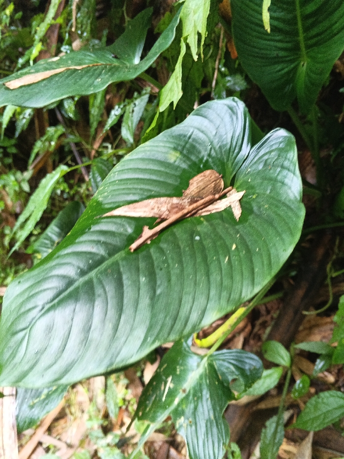 A large, dark green heart-shaped leaf dominates the frame. Its surface is ribbed and smooth. A small, broken twig rests on the leaf, appearing dry and brown against the vibrant green. Surrounding the central leaf are other leaves, blurring into the background of the lush foliage. Some have similar dark green hues, while others are lighter or variegated. The setting suggests a dense, natural environment with varied plant life.