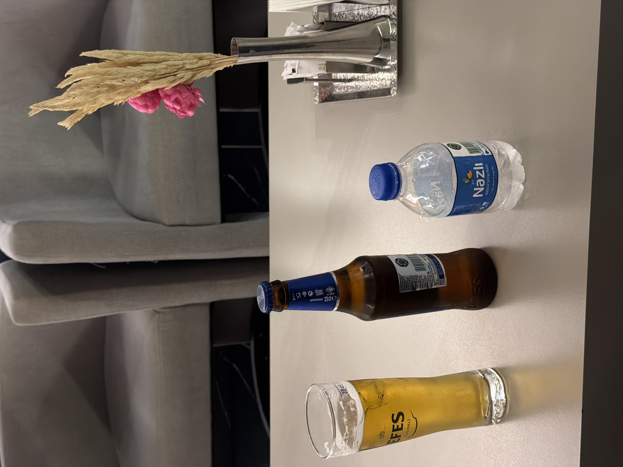 The image depicts a horizontal surface with various objects arranged upon it. These include a decorative vase with dried wheat stalks and two pink flowers, a water bottle labeled "Nazli Natural Spring Water," a brown beer bottle, and a glass of Efes beer. The background features a neutral-toned sofa. The location is Serik, Turkey, based on the Efes beer which is brewed in Turkey.
