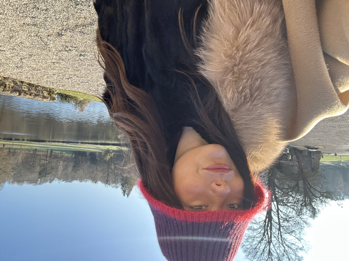 An outdoor portrait features a female individual positioned slightly left of center, looking directly at the viewer. She wears a dark red and red-striped knitted bucket hat, a black garment, and a camel-colored coat with a light brown faux fur collar. Her long, dark brown hair is visible beneath the hat. The scene is brightly illuminated by direct sunlight, casting highlights on her hat and fur collar. In the background, to the left, are stone ruins and deciduous trees with bare branches on a grassy lawn. To the right, a tranquil body of water, likely the Étang de l'Abbaye, reflects a clear blue sky, bordered by a treeline in the distance. The immediate foreground is a light-colored gravel surface with a low stone wall. This location is the grounds of the Abbaye des Vaux de Cernay in Cernay-la-Ville, France.