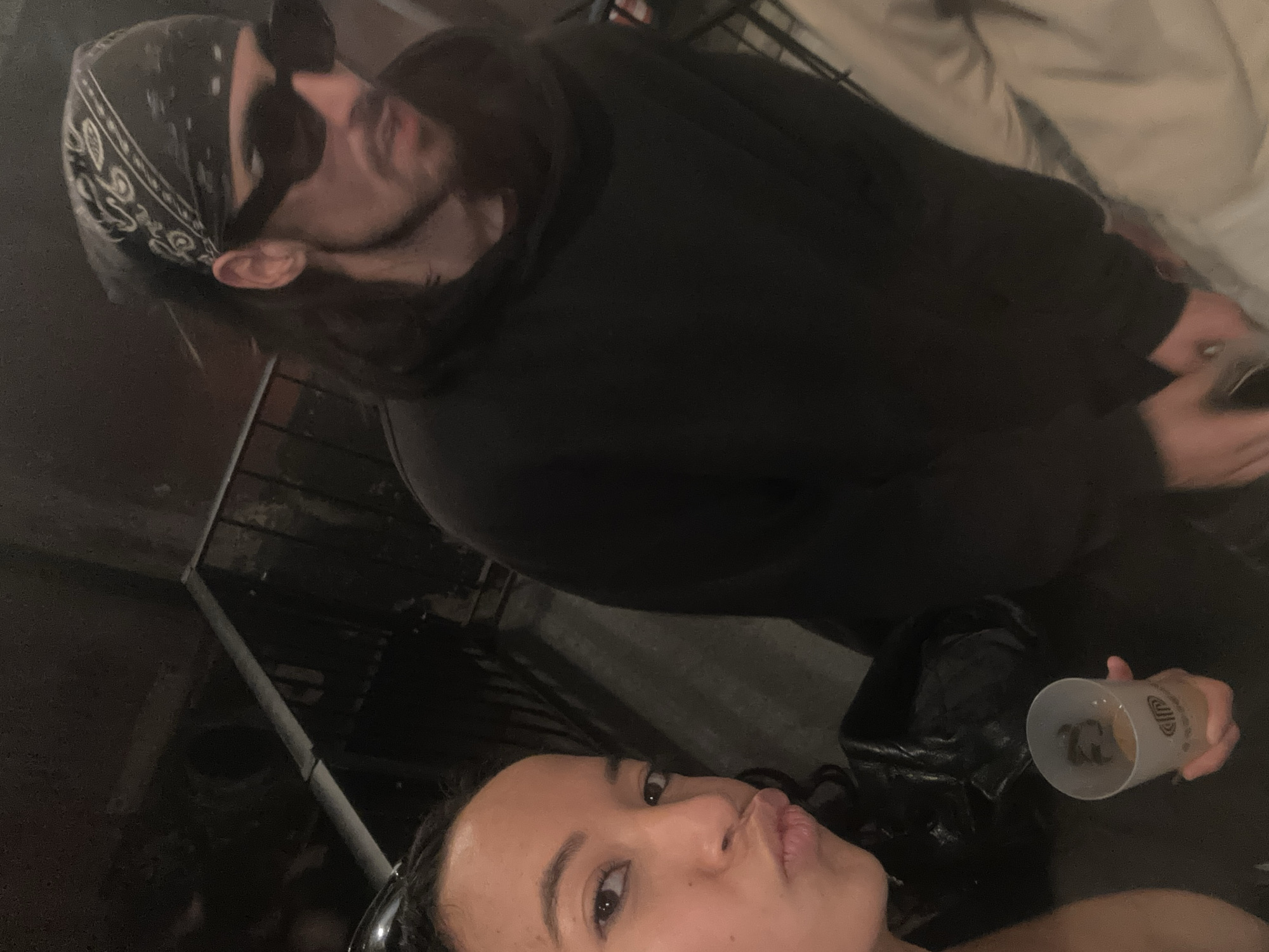A rotated, medium-shot indoor photograph shows a woman and a man posing for the camera. The woman is positioned at the bottom of the frame, her face looking upward with pursed lips. A black jacket is visible on her left. She is holding a translucent plastic cup in her right hand. The man is positioned above her, wearing a black hoodie, sunglasses, and a bandana on his head. The background is dark and slightly out of focus, with a metal railing visible on the left side. The location is suspected to be indoors, in Lisbon, Portugal.