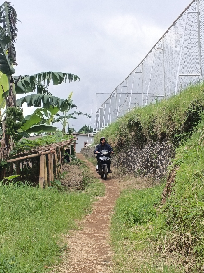 An individual operates a dark-colored motorcycle on a narrow, unpaved dirt path in the city of Pinnwe, Myanmar. The subject, wearing a dark hooded jacket with the hood up, faces forward, riding towards the viewer. The path is reddish-brown earth, flanked by tall green grass and vegetation. To the left of the path, a banana tree with green fruit is visible, alongside a rudimentary wooden structure made of bamboo. To the right, a steep embankment features a dry-stacked stone wall at its base, topped with lush green and brownish grass. Above the embankment, a long section of white-framed chain-link fence extends diagonally across the upper right quadrant. The sky is overcast and grey.