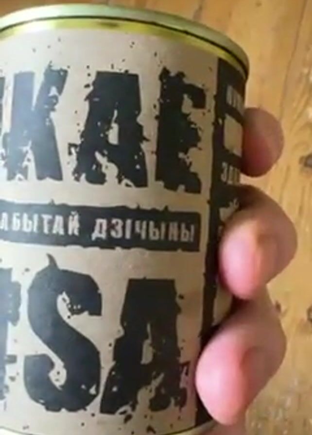 A person is holding and rotating a can of what appears to be canned meat. The label is primarily in Russian and depicts a bear. The background is a light-colored wooden floor. The can is round and made of metal. The person's hand is light-skinned. The can is held in focus, while the background is slightly blurred. The lighting is moderate and somewhat diffused.