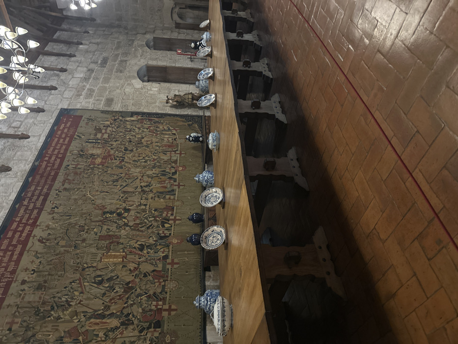 An interior shot shows a long wooden table along a stone wall adorned with a large tapestry depicting a historical scene. Blue and white decorative plates and vases are mounted along the table's edge. The wall opposite the table is made of brick. The table reflects rows of dark wooden benches or stools. A chandelier hangs from the ceiling.