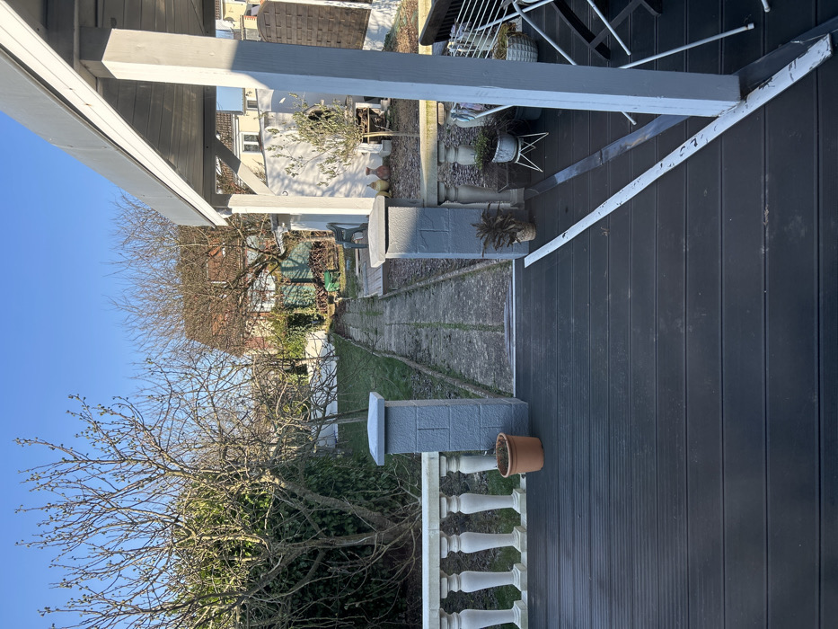 The image presents a residential backyard in Saint-Quentin, France, viewed from a dark grey composite deck on a clear, sunny day. The foreground consists of horizontal composite decking planks. To the left, a white balustrade with several balusters is adjacent to a grey block-textured pillar. An empty terracotta pot sits on the deck near this pillar. A corresponding grey pillar is located to the right, framing the entrance to a garden path. Next to the right pillar, a potted plant with dark, possibly fern-like leaves is visible. Two long, narrow strips, one white and one dark, lie on the deck to the right, extending towards a white structural post supporting a light-colored pergola roof. Partially visible to the far right are a white metal clothes drying rack and a brown folding chair. The midground features a narrow, unpaved path with concrete sections and interspersed grass, extending into the background. To the left of the path, dense, leafless trees and green foliage line a boundary. To the right, a white wall parallels the path, with a small tree (possibly an olive tree) in a pot and several other decorative pots placed against it. A small wooden platform is visible further along the path on the right. The background shows a garden area sloping slightly upwards. More bare trees are present, and a green plastic chair is visible in the distance on the right. Residential buildings with reddish-brown tiled roofs and light-colored facades are discernible beyond the garden, under a cloudless blue sky. No individuals or active subjects are present in the scene.