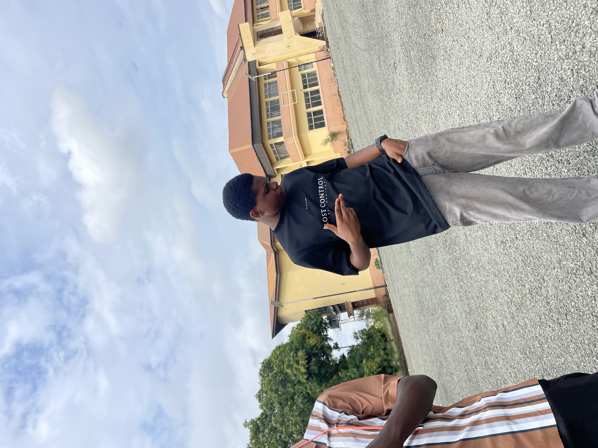 The scene is an outdoor daytime setting on a gravel-paved surface in front of a multi-story building. The location is an unidentified area within the city of Unknown, Unknown. **People:** Two males are visible. The primary subject, positioned center-right, is a dark-skinned male with short, dark, curly hair. He is wearing a black short-sleeved t-shirt with "LOST CONTROL" printed in white text on the chest and light gray loose-fitting pants. A dark watch is on his left wrist. His right hand is raised with the index finger extended, pointing forward and slightly downward, while his left hand is in his pants pocket. His head is turned down and slightly to his left. A second male is partially visible on the far left, showing only his torso, right arm, and shoulder. He is dark-skinned and wears a vertically striped short-sleeved shirt with alternating brown, white, and light gray stripes. He appears to be holding a smartphone with both hands at waist level. **Subjects and Objects:** The primary subject is the male in the black t-shirt. The main background object is a two-story building with yellow-orange plastered walls and a reddish-brown tiled roof. The building features multiple large windows with white frames and what appears to be a balcony or recessed section on its upper floor. A street lamp with a white solar panel attached is positioned in front of the building, towards the center-right. To the far left of the building, a dense cluster of green trees is visible. A small white motorcycle is parked near an entrance of the building on the right side. The ground beneath the individuals is covered with small, light gray gravel or crushed stone. **Actions and Interactions:** The primary subject is posing, looking downwards while making a hand gesture. The partially visible male on the left is holding a smartphone. No direct interaction between the two individuals is evident. **Environment:** The sky is partly cloudy with large patches of white and light gray clouds, indicating an overcast or partly cloudy day with diffused natural light.