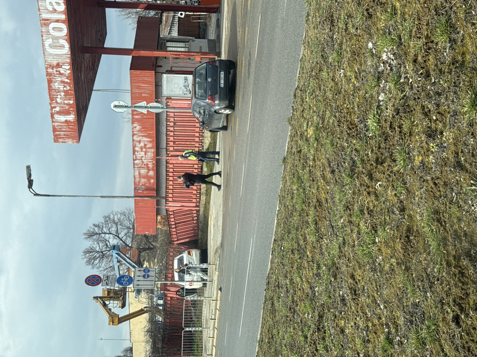 The image displays an outdoor scene on an overcast day, situated roadside in Sofia, Bulgaria, indicated by the "CB" license plate on a vehicle and Cyrillic signage. In the foreground, a sparse, muddy grassy verge with patches of green leads to a two-lane asphalt road. On the paved area off the road to the left, a white sedan is parked partially on a curb, angled towards the road. Its driver's side door is open, and a light-haired individual in a light-colored top stands beside it. Adjacent, a pole displays multiple traffic signs, including "No Entry/No Stopping," "Bicycle Lane," and lane direction arrows. To the right, a gray Volkswagen Golf (license plate CB 1280 AX) is parked on a paved section. Two males are present on the sidewalk nearby: one in dark clothing walks from left to right, holding a dark object, possibly a camera or phone, pointed towards the scene. The other male, wearing a yellow high-visibility vest over dark clothing, stands stationary, facing the individual walking. In the background, a weathered red-painted building with a prominent canopy displays the white Cyrillic text "Супер Кола" (Super Cola). A small booth-like structure is visible beneath the canopy. An old, tall streetlamp stands in front of this building. A dilapidated red slatted fence runs along the property line behind the sidewalk. Beyond the fence, a yellow hydraulic boom lift and a blue piece of construction machinery are visible. The sky above is mostly overcast with some lighter patches.