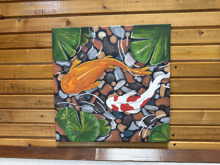 The image displays a colorful square painting mounted vertically on a light brown wooden plank wall in Razlog, Bulgaria. The painting, rendered in an illustrative style, depicts an aerial view of a pond environment. The central subjects are two koi fish: one predominantly orange or gold, positioned diagonally with its head towards the upper left, and one smaller white fish with distinct red markings, swimming towards the upper left below the orange fish. Both fish exhibit flowing fins and are surrounded by white wavy lines indicating water movement. Three prominent green lily pads with visible veins are depicted: one in the upper left corner, one in the upper right, and one in the lower right. The pond bed is characterized by numerous irregularly shaped pebbles and rocks in various shades of grey, brown, black, and hints of blue. The wooden wall consists of several vertical planks with visible grain, knots, and occasional screws. A narrow vertical strip of a lighter, possibly painted or textured, wall surface is visible along the left edge of the frame. No individuals are present in the image.