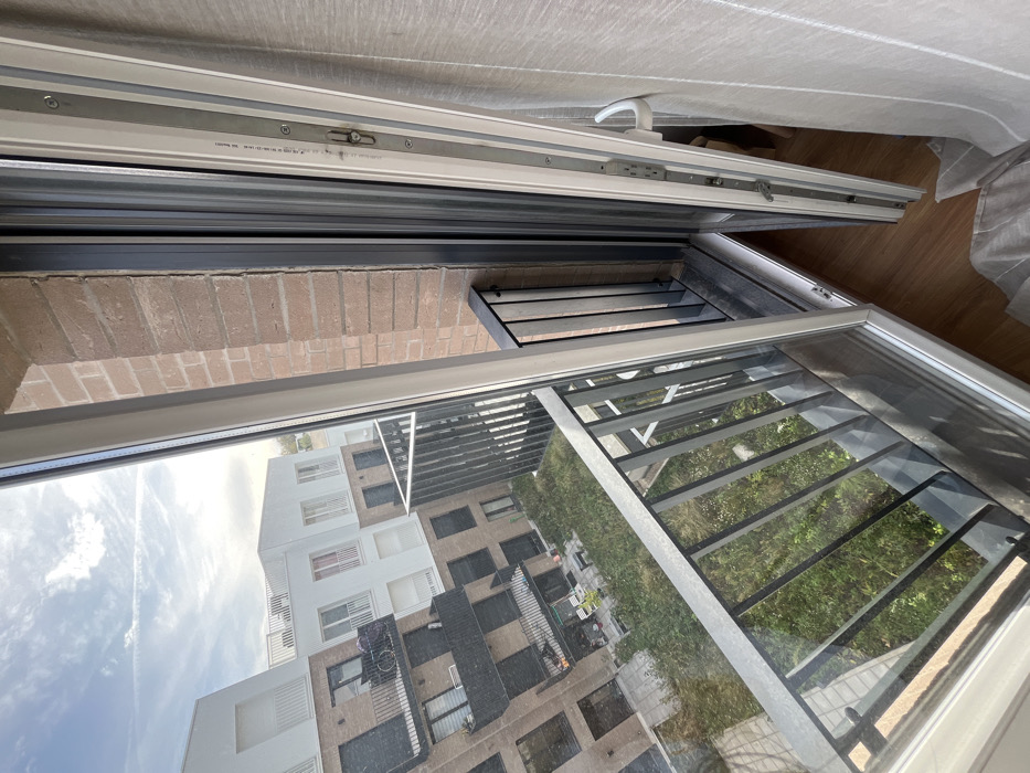 The image displays an outward view from an opened balcony door of a residential unit in Villeneuve-d'Ascq, France. The perspective is slightly angled downwards, looking across a green space towards other modern residential buildings under a partly cloudy sky with a visible airplane contrail. In the immediate foreground, to the right, a white fabric curtain hangs partially visible. A white-framed, hinged door, likely a balcony door, is open inwards, revealing its internal locking mechanisms and a white handle. The flooring visible inside is light brown wood. The opened door leads to a balcony. A dark gray or black metal railing with vertical balusters defines the edge of the balcony in the midground, with a section of exterior brick wall visible between the door and the railing. Beyond the balcony, a ground-level courtyard area is visible, dominated by unkempt green vegetation. Within this green space, directly below and across, a paved patio section is present, furnished with a white table and chairs. Two individuals are discernible on this patio; one wears a yellow high-visibility vest, and the other a white top, near what appears to be construction-related materials or equipment. In the background, a complex of modern residential buildings stands. One structure, closer to the left, features a dark, possibly brick or panel, facade with several balconies, one of which displays a bicycle. Further back and to the right, other buildings exhibit white facades with white railings, suggesting multi-story apartment blocks. Some windows on these buildings feature closed white roller shutters.