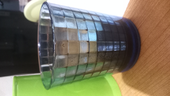 The scene, located in Surabaya, Indonesia, depicts an indoor environment. A blue-tinted glass tumbler, featuring a grid-like pattern of square indentations on its exterior, occupies the central foreground, containing a small volume of dark liquid settled at its base. To the immediate left, a portion of a vibrant green, opaque plastic cup is visible. Both vessels are resting on a light brown wooden surface, exhibiting visible grain patterns. In the background, behind the central tumbler, a dark, indistinct vertical mass is present, and to the far right, the curved upper edge of a light-colored, possibly cream-colored, plate or bowl is partially visible. No individuals are present, and all depicted objects are static.