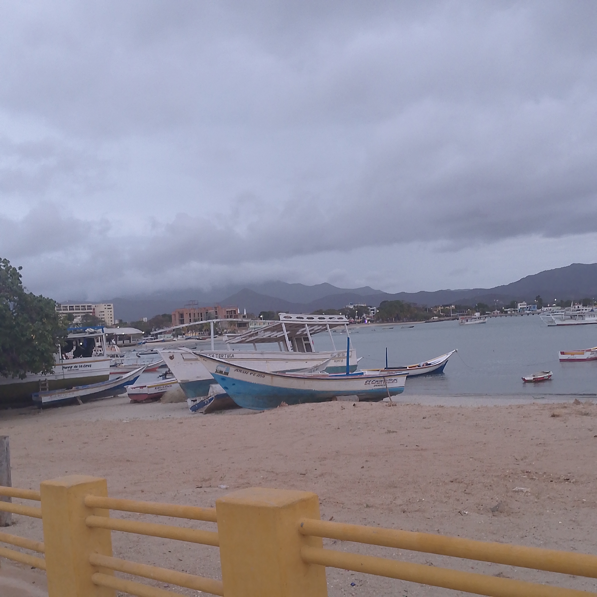cloudy day at a beach in Juan Griego, Venezuela. In the foreground, a yellow railing is visible. The middle ground is filled with sand and several small boats, most of which are pulled up onto the beach. The water is calm and reflects the grey sky. A few boats are in the water. In the background, mountains are visible. Buildings of varying sizes are scattered along the coast. The overall atmosphere is muted due to the overcast sky.