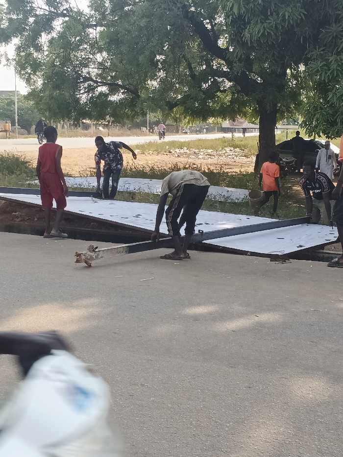 The image depicts a construction or repair scene on a paved road in Doma, Nigeria, under daylight conditions. Multiple individuals are present, primarily focused on metal panels laid across what appears to be a trench or culvert opening in the road. In the mid-ground, a series of large, rectangular metal panels, light-colored or freshly painted white, span a gap in the asphalt road. Several men are actively engaged with these panels. A man in a dark patterned shirt and dark trousers bends over the panels, appearing to apply a white substance to their surface with a tool. To his left, a young male in a red sleeveless top and red shorts stands observing the activity. To his right, a man with his back to the camera, wearing a light t-shirt and dark track pants, is bent over, holding a dark metal beam that rests partially on the asphalt and partially near the panels. Another dark metal post or beam with attached fixtures lies horizontally on the paved road in front of him. Further to the right, a man in an orange t-shirt carries a light-colored bucket, walking away from the primary activity, and another man in a dark t-shirt with a white emblem is bending near the panels. The paved road extends into the background, flanked by a wide, unpaved shoulder of dry earth and sparse vegetation. Large, leafy trees with dense canopies dominate the upper part of the background, casting shadows. In the distance along the road, several individuals are visible; one on a bicycle is seen on the left, and another on a bicycle is visible further right. A group of people, including one in white traditional attire, stands near what appears to be a parked vehicle on the far right background. The foreground shows a blurred hand, possibly holding a white plastic object, suggesting the perspective of an observer.