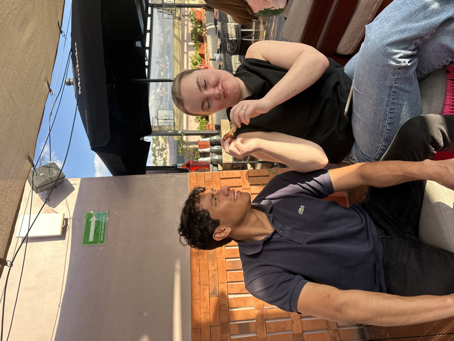 Two people are sitting outdoors. A woman in a black sleeveless top and jeans is holding a piece of food. A man in a navy blue polo shirt and black pants is next to her. The setting appears to be a rooftop restaurant or bar with a view of a city. A black awning is visible overhead. There's a brick wall behind the man. A building wall with a green exit sign is beside the awning.