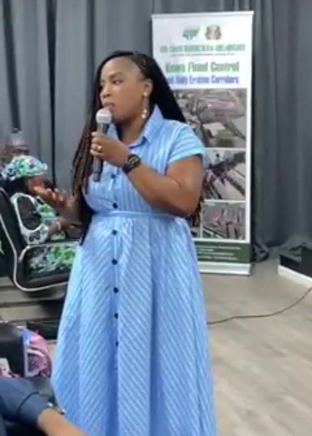 A woman with braided hair is speaking into a microphone at an event. She is wearing a light blue, striped, button-down dress. She is standing in front of a banner that reads "Kwawo Flood Control and Gully Erosion Corridors." There are people seated in the audience. The setting appears to be an indoor meeting room with drapes.