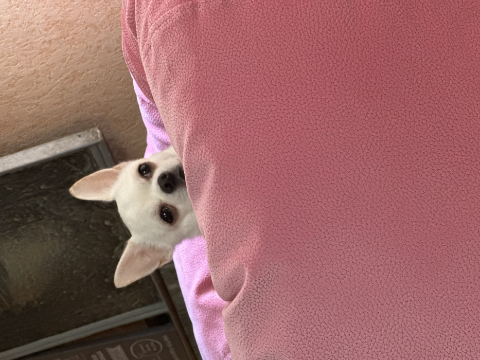 - "A small, white Chihuahua dog is depicted in a close-up, eye-level perspective, peeking over a textured, solid pink fabric object, likely a blanket or cushion" by FM-SwIAh1, licensed under CC BY 4.0