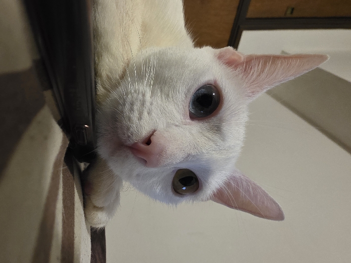 A white cat with heterochromia leans into the frame. One eye is blue, the other is brown. The cat's pink nose is prominent. The cat is positioned upside down relative to the viewer, partially obscuring the left side of its face with a dark, vertical object. The background consists of beige and white tones, with glimpses of wood and other objects.
