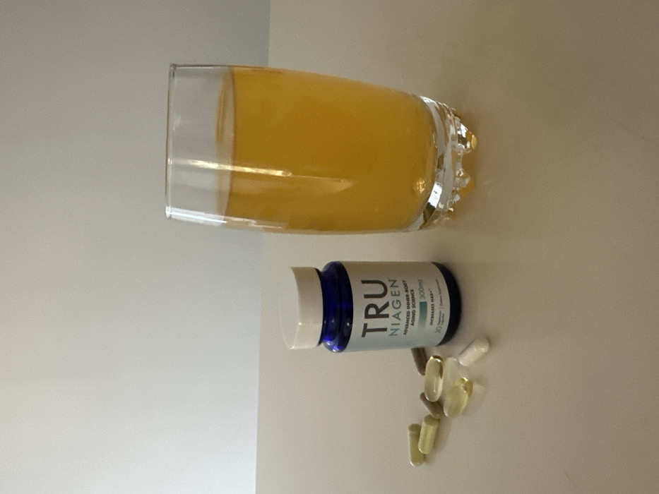 - "A glass of orange juice rests on its side next to a bottle of Tru Niagen capsules" by FM-IkaP23, licensed under CC BY 4.0