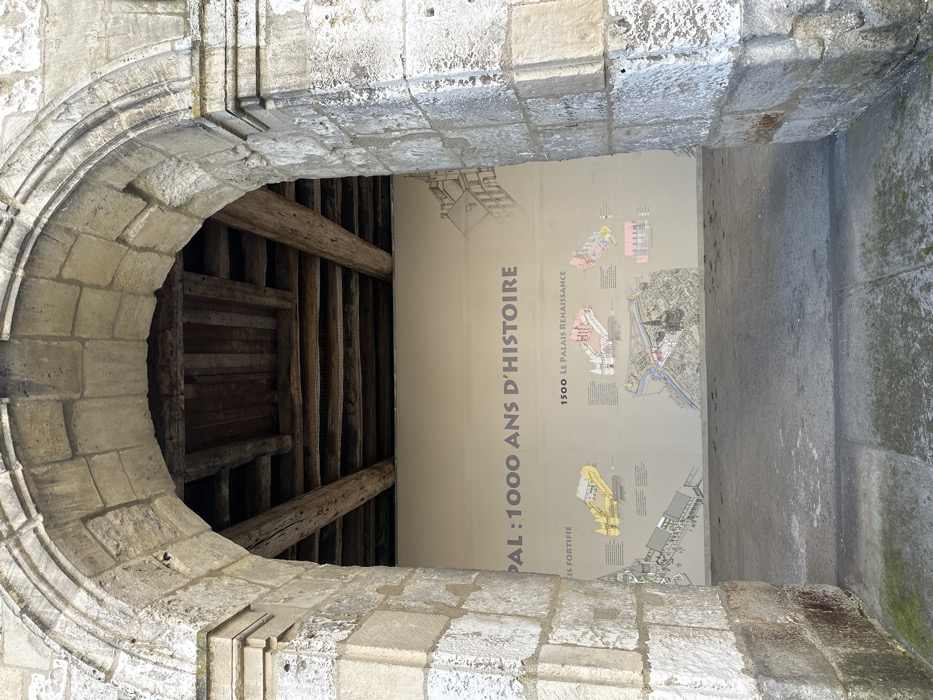 The image displays a direct, eye-level view through a large, weathered stone archway into an interior space. The archway, constructed from light-grey, irregular stone blocks, features a rounded top and forms a passageway. Above the visible interior, a ceiling of dark, exposed wooden beams runs perpendicular to and parallel with the viewing angle. Beyond the arch, a prominent, light beige or off-white wall serves as a historical display panel. Large grey lettering on this panel reads "PAL : 1000 ANS D'HISTOIRE." Below this, additional text includes "PALAIS FORTIFIÉ" and "1500 LE PALAIS RENAISSANCE." Accompanying the text are several detailed, multi-colored historical maps or architectural diagrams, depicting the evolution of a structure. One map, colored yellow, is associated with "PALAIS FORTIFIÉ," while another, colored pink, is linked to "1500 LE PALAIS RENAISSANCE." The content of this display indicates the location is within or leading to the Palais Épiscopal (Bishop's Palace) in Beauvais, France. The floor of the interior space is a flat, grey concrete or stone surface. No individuals or objects other than the architectural elements and the informational panel are present in the scene.