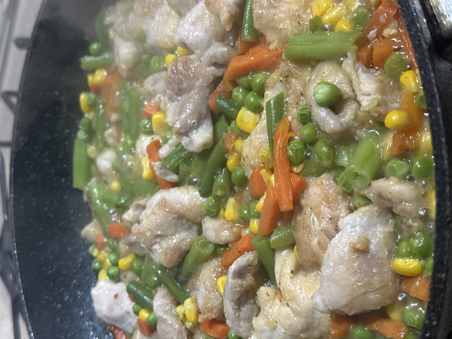 A dark-colored frying pan, positioned over a heat source, is observed in a close-up, overhead view within an indoor kitchen in Fowlis Easter, United Kingdom. The pan contains a mixture of diced white meat, consistent with chicken, intermingled with cut green beans, orange diced carrots, yellow corn kernels, and green peas. The ingredients are submerged in a visibly simmering, light-colored liquid, producing steam. The chicken pieces exhibit some surface browning. No individuals are present in the frame.
