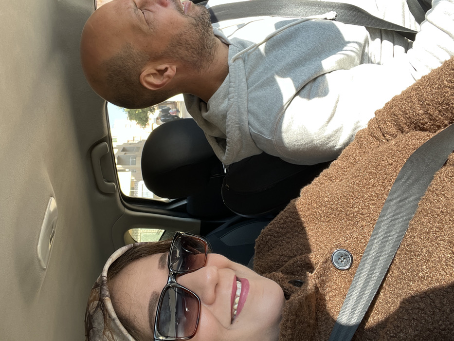 A female and a male occupant are seated inside a vehicle during daytime in Ouislane, Morocco. The image is captured from the perspective of the female, who is in the front passenger seat, looking forward and smiling towards the camera. She wears dark sunglasses, a camouflage-patterned headband, and a brown textured jacket secured by a visible gray seatbelt. Her lips are tinted with pink lipstick. The male occupant, seated to her right, is bald with a dark beard and wears a light gray hooded sweatshirt. He is looking forward and slightly to the right, away from the camera. Through the vehicle's side windows, an urban street scene is visible, featuring multi-story buildings with balconies and indistinct pedestrians on a sidewalk. Bright sunlight illuminates the scene, casting shadows within the vehicle's light-colored interior, where an overhead light fixture is visible on the ceiling.