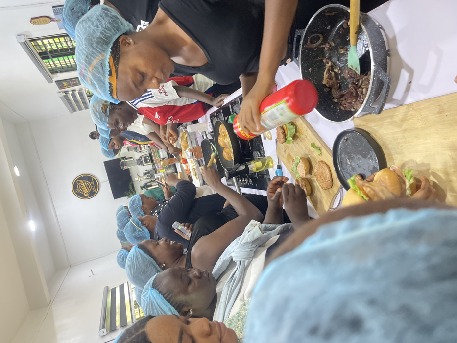 In a bright, modern kitchen located in Bar Jirgi Summa, Nigeria, approximately 10 to 12 adult women are engaged in a cooking activity, primarily focused on burger preparation