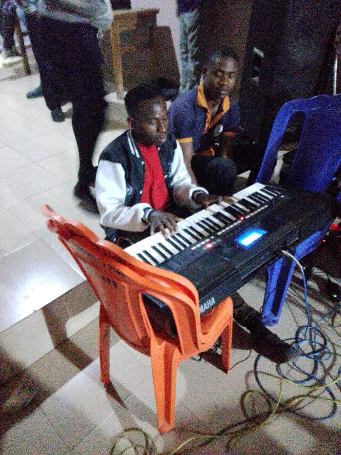 A man wearing a red shirt and black and white jacket is sitting on the floor, playing a black Yamaha keyboard. The keyboard is propped up by two plastic chairs, one orange and one blue. Another man is seated behind him, observing. Cables and wires are scattered around the base of the chairs. The background shows other people standing or sitting, indicating an indoor setting. The floor appears to be tiled.