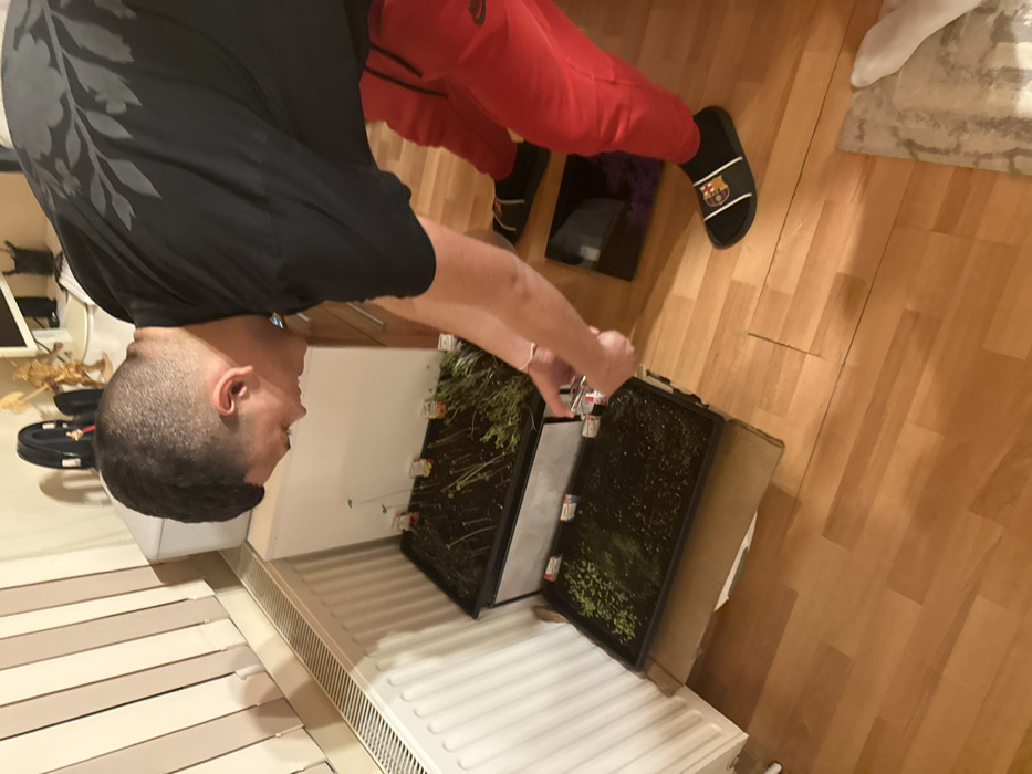The image depicts an indoor scene with a light brown wooden floor and a white radiator beneath white vertical blinds on the left. A male individual, fair-skinned with short dark hair, is positioned centrally, bending forward and looking down. He wears a black t-shirt with a grey patterned back, red track pants with a white Nike logo, black socks, and black FC Barcelona slide sandals. A light-colored bracelet is visible on his right wrist. In front of the male are two black rectangular trays containing dark soil and numerous green sprouts or seedlings. The lower tray rests on a piece of cardboard. Several small plant markers, some with yellow or red tops, are embedded in the soil of both trays. The individual is holding a small, metallic object, likely a watering device, over the lower tray of plants, suggesting an action of tending to them. To the right of his feet, a black rectangular object lies on the floor. In the background, to the right of the radiator, a white cabinet is visible, with a computer monitor, black headphones, and a golden decorative figurine on a surface above it. The image does not contain verifiable visual information to confirm the specific city of Haskovo, Bulgaria.