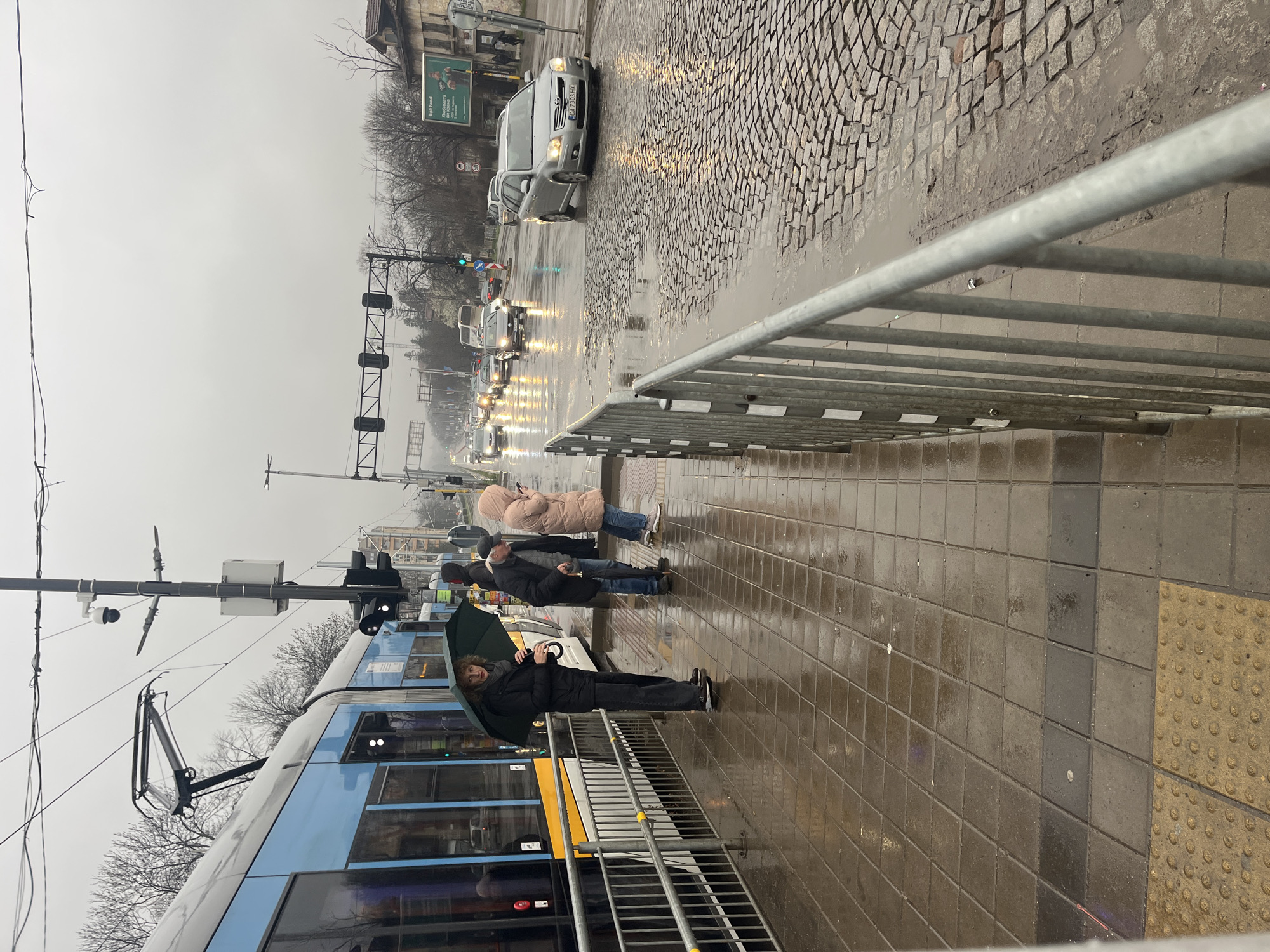 The image captures a rainy day scene in Sofia, Bulgaria. A tram, painted in blue and yellow, is positioned on the left side of the frame. Several individuals are waiting at the tram stop, some holding umbrellas. The ground is wet and reflective, indicating recent or ongoing rain. The street, constructed with cobblestones, is visible beyond the tram stop, with cars driving on it. Traffic lights are seen in the distance, and a road sign is mounted on a pole. The sky is overcast, and the overall atmosphere suggests a gloomy day. A metal railing divides the sidewalk from the street.