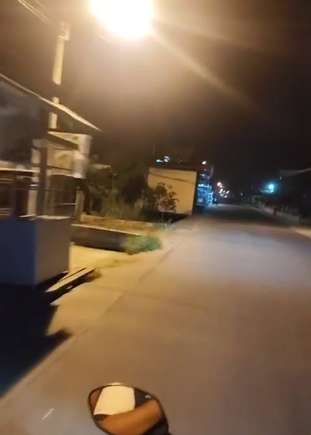 A first-person perspective video shows a person riding a motorcycle down a street at night. The street is paved and lined with buildings, some of which are illuminated by streetlights. The night sky is dark. The motorcycle's rearview mirror is visible.