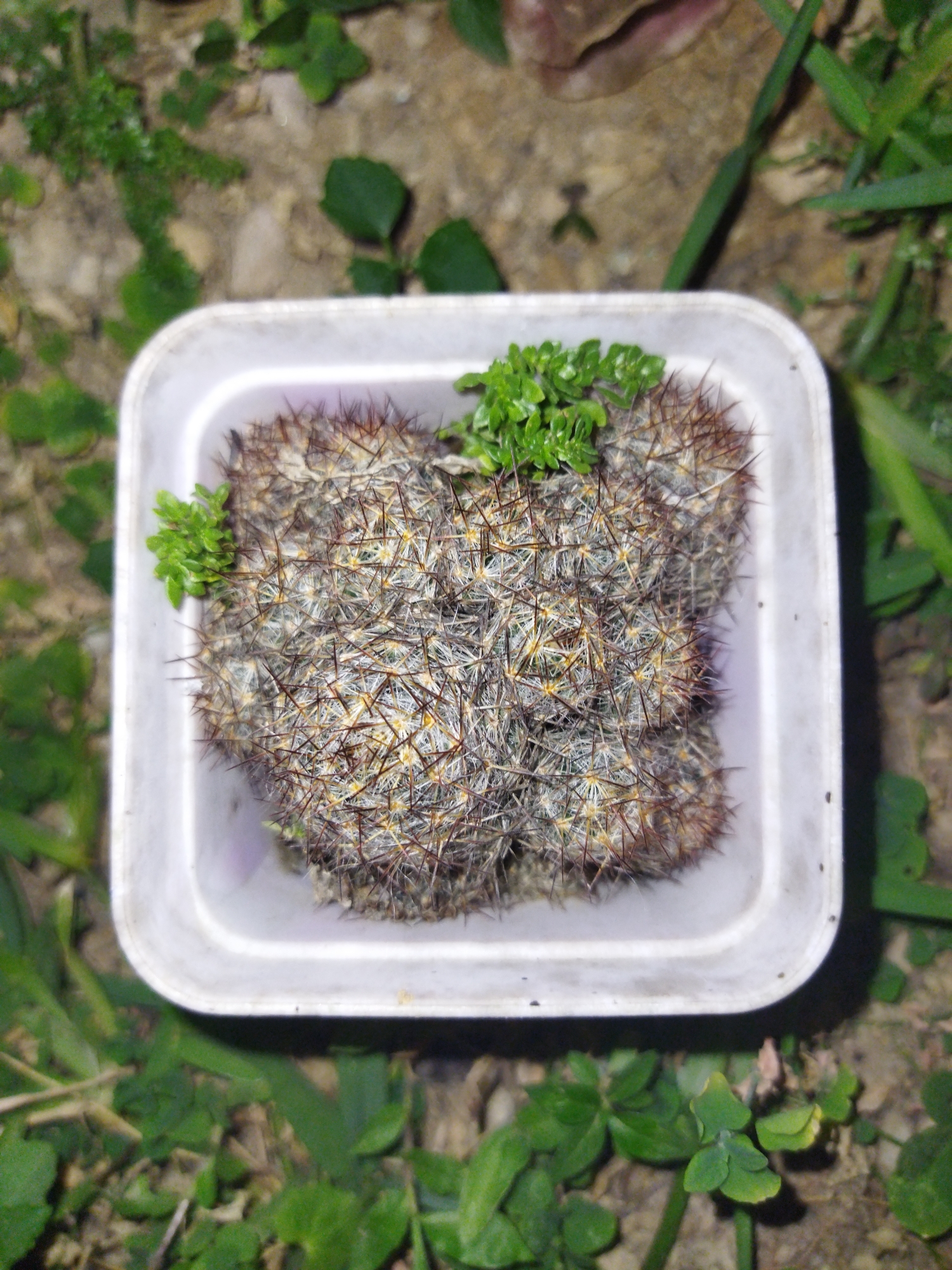 The image depicts a cactus in a square, white plastic pot. The cactus is covered in dense brown and white spines. Green plants are growing on top of the cactus and around the pot. The pot is sitting on a surface covered in green plants and grass. The location is Tinaquillo, Venezuela.