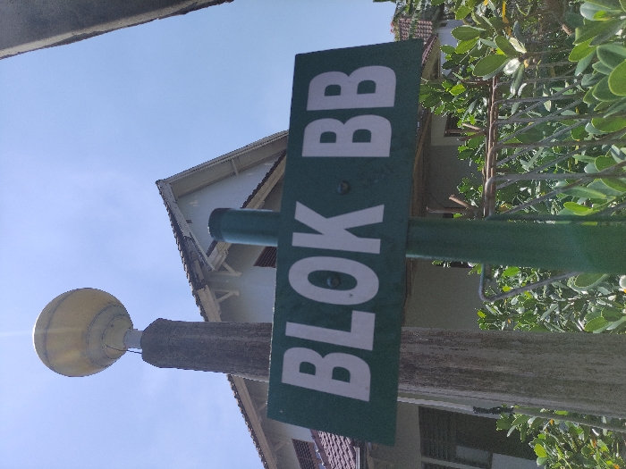 A low-angle view captures an outdoor scene in Nieste, Germany, under a clear blue sky. The prominent subject is a rectangular green sign with white capital letters reading "BLOK BB," mounted on a dark green metal pole in the lower-middle of the frame. To the left, a weathered concrete lamppost with a spherical yellow-white globe light fixture extends upwards. Behind the sign and lamppost, a building with a light-colored facade and a dark tiled, pitched roof featuring white eaves is partially visible. The lower foreground and mid-ground are filled with dense green foliage, likely shrubs, and a segment of a light-colored metal fence or railing is partially obscured within the greenery. The bright sun creates a visible glare around the lamp fixture.