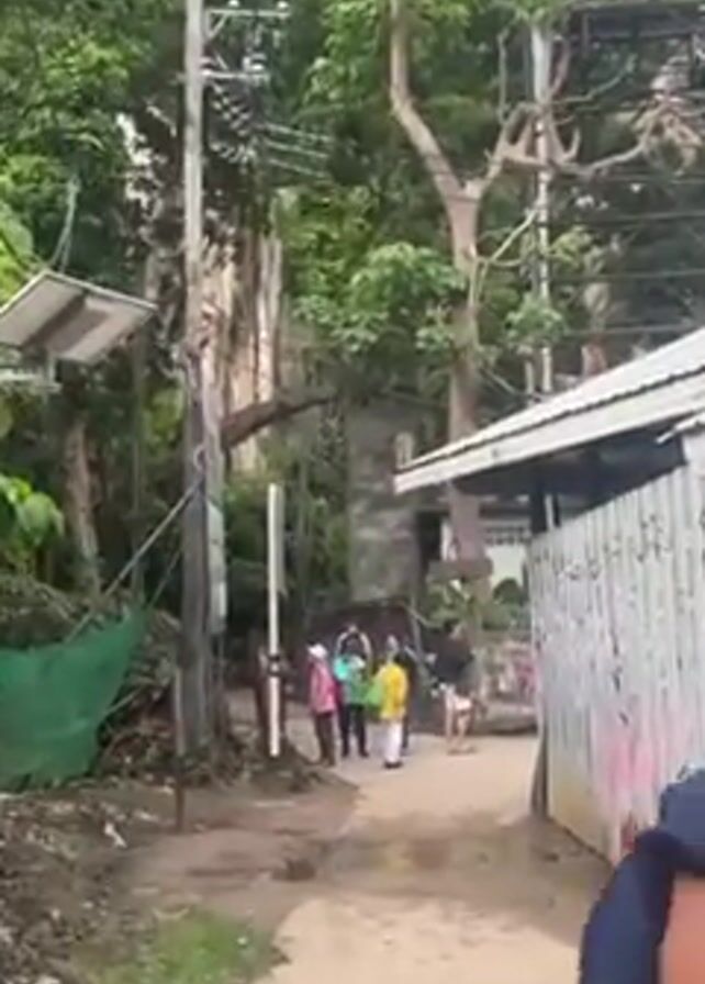 narrow dirt path in a tropical setting. A group of people, some wearing bright clothing, stand in the path ahead. Overhead, power lines are strung between utility poles. Lush green trees and foliage surround the path. To the right is a corrugated metal structure with graffiti on it. A monkey is visible on the roof of the structure. The perspective is that of someone walking along the path.