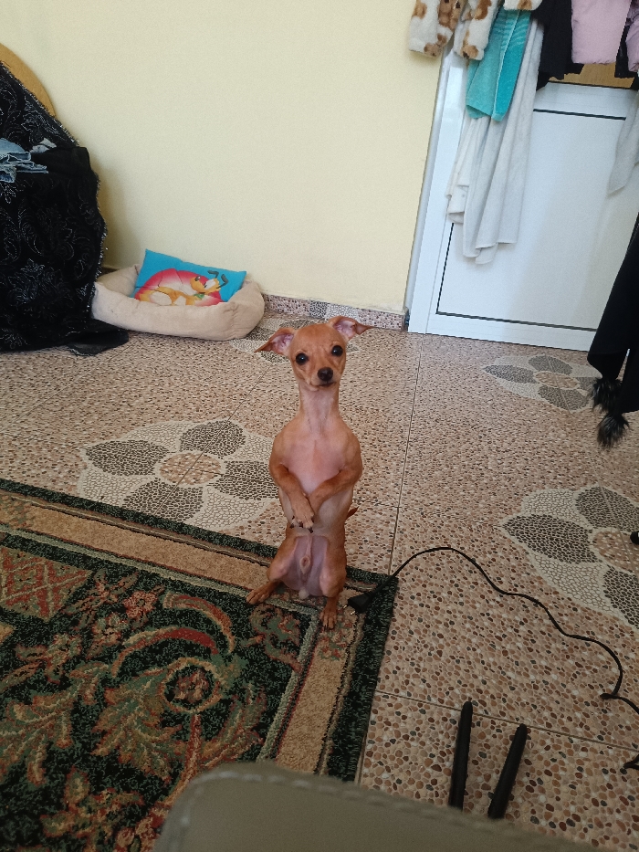 - "A small, tan-colored male dog, likely a Chihuahua or similar breed, stands upright on its hind legs with its front paws held together at chest level, looking directly at the camera" by FM-xADo03, licensed under CC BY 4.0