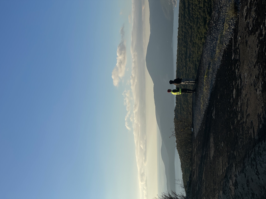 The image depicts an elevated outdoor scene in Dubravcevina, Montenegro, under a clear blue sky with some low-lying clouds near the horizon. Two individuals stand on a gravel path at the crest of a hill, facing each other in a slight turn, suggesting interaction. The person on the left wears a yellow-green reflective vest over dark clothing, dark pants, and a red beanie, holding a dark object in their hands. The person on the right wears dark clothing and a dark beanie, also appearing to hold a dark object. Beyond them, a dense expanse of dark green vegetation covers rolling terrain, leading to a body of water, likely a bay, bordered by a series of progressively larger, darker mountain ranges in the distance. The immediate foreground consists of dark, uneven ground transitioning to the lighter gravel path.
