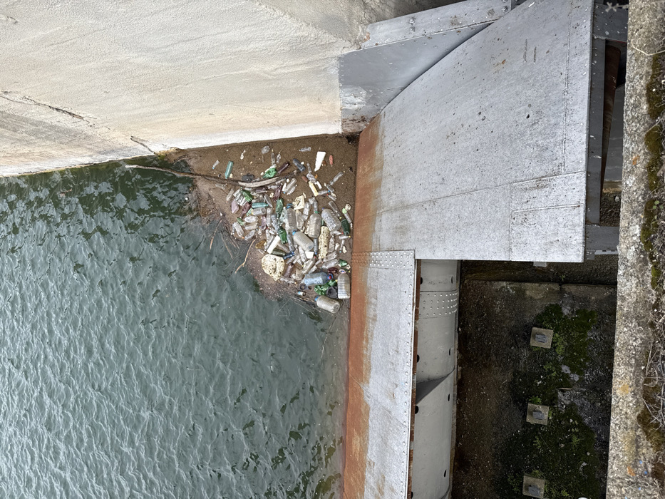 An overhead view captures a segment of the Panicherevo Reservoir in Panicherevo, Bulgaria, depicting a concrete embankment and metallic hydraulic infrastructure. The upper left quadrant features rippled, dark green water. Along the water's edge, against a light gray concrete wall on the right, a concentrated accumulation of debris is visible, primarily consisting of numerous plastic bottles of various sizes and colors, alongside some organic matter and other refuse, resting on a narrow sandy bank. The concrete wall shows vertical cracks. In the lower half of the image, a large, flat, riveted metal surface, appearing to be a segment of a sluice gate or dam structure, extends horizontally. This metal surface is gray with significant rust staining on its upper left portion. Below this structure, a dark, recessed area reveals concrete foundations partially covered in green moss. No individuals are present in the scene.
