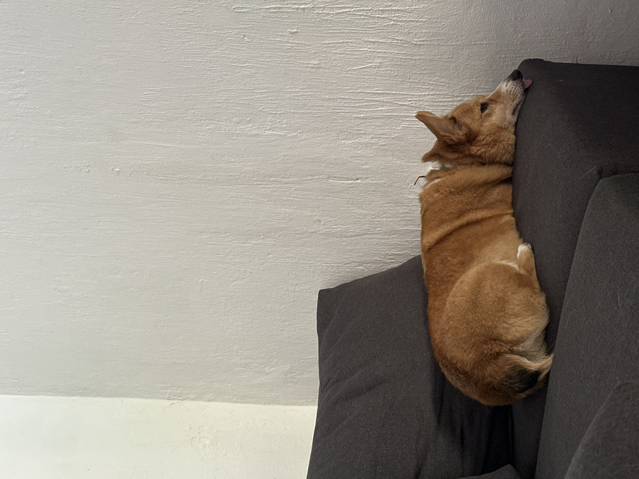 The image depicts an indoor scene within a residential setting in Santa Ana Tepetitlán, Mexico. The primary subject is a reddish-brown, medium-sized dog, possibly a Corgi or Corgi mix, with pointed ears and a visible light-colored collar around its neck. The dog is observed lying on its left side on a dark grey fabric sofa, resting its head on the sofa's armrest. Its eyes appear partially closed, and a small portion of its tongue protrudes from its mouth. The background consists of a light-colored, textured wall, with an interior corner visible in the upper left quadrant of the frame. No other individuals or significant objects are present within the captured scene.