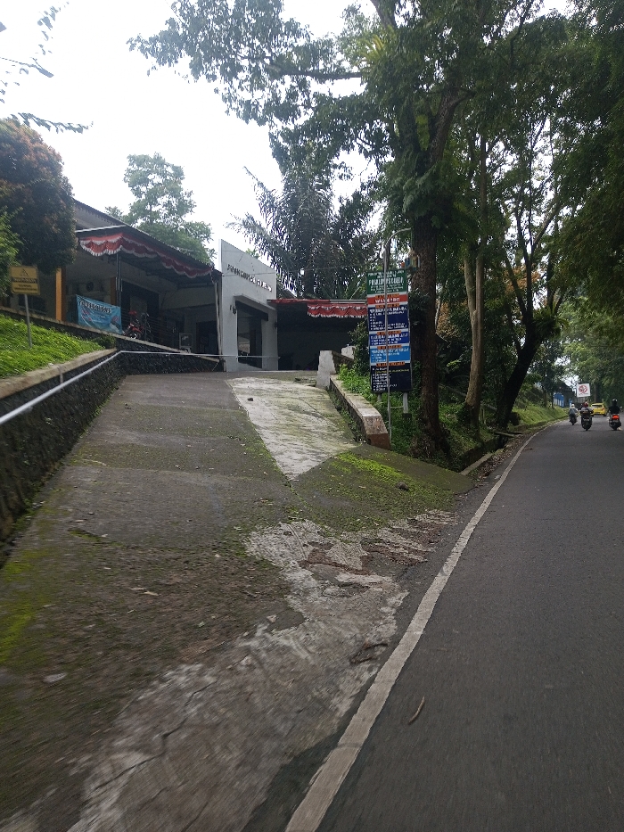 This image depicts an outdoor scene in Sandamal Eliya, Sri Lanka, featuring a roadside with an adjacent building complex and heavy vegetation under an overcast sky. In the foreground, a moss-covered concrete access ramp slopes upward from the right towards a building, bordered on the left by a low stone wall with a metal railing. The ramp surface shows signs of wear and cracking. To the right of the ramp, an asphalt road with a solid white edge line extends into the distance. A concrete drainage channel separates the road from a grassy embankment on the right. In the midground, at the top of the ramp, a series of light-colored buildings with red and white striped awnings are visible. The central building features a prominent sign above its entrance, partially obscured, with visible characters suggesting "PAMAND". A blue banner with white text is affixed to the left-most building. A yellow sign displaying a wheelchair symbol is positioned on the grassy slope to the far left. Several motorbikes are parked in front of these buildings. To the right of the ramp and alongside the road, a tall, multi-panel informational sign stands. It displays various colored sections with text, including "PRAMUKA PEDULI" and "WALAHAN", alongside other details. The background is dominated by a dense canopy of tall, green trees that line the road and obscure the horizon. The sky is uniformly grey and overcast. Further down the asphalt road, three motorbikes are visible, with a yellow vehicle partially discernible beyond them. No human figures are clearly identifiable.