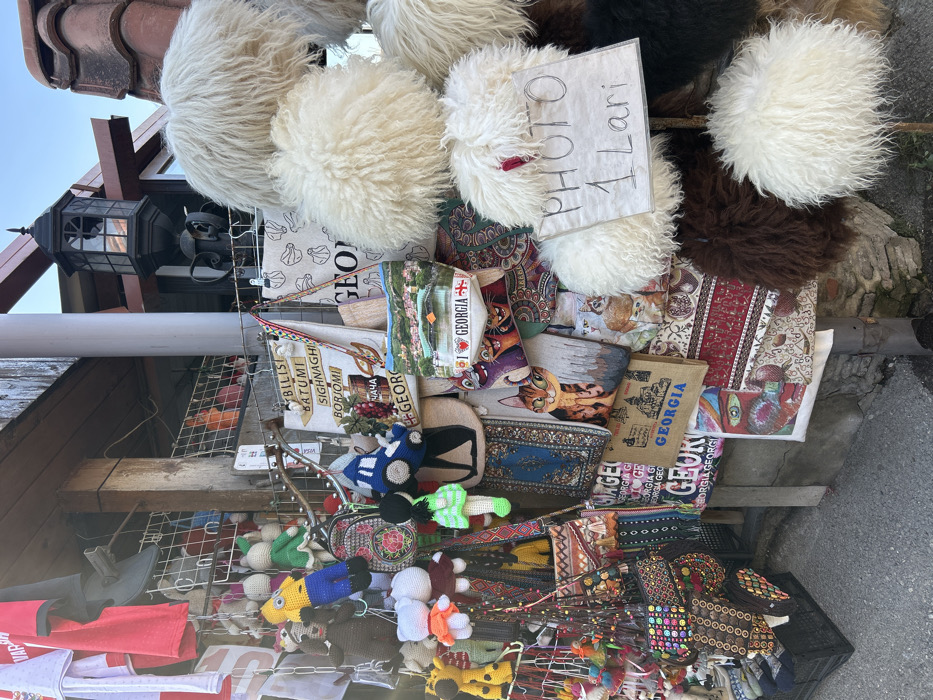 The image captures a densely arranged outdoor souvenir stall located in Sighnaghi, Georgia