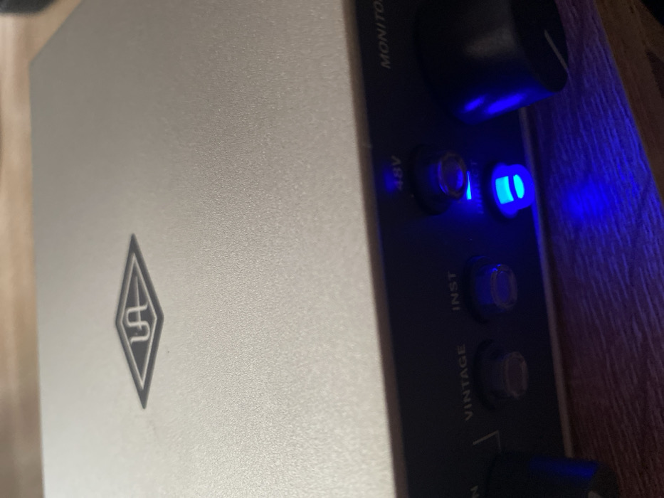 The image displays a close-up, elevated view of a Universal Audio (UA) branded audio interface