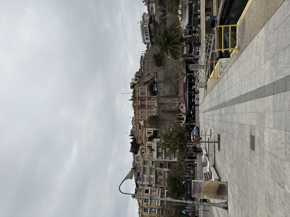 The image displays a waterfront promenade in Kavala, Greece, looking towards a densely built hillside crowned by historic structures. The foreground features a wide, light-grey paved promenade with a darker central strip. On the left, a modern, curved streetlamp stands next to multiple concrete benches with wooden slats. Small, leafless trees are planted in square cutouts along the promenade. Cardboard boxes are propped against a utility pole near the streetlamp. To the right, a concrete dock with bright yellow metal railings extends into the dark water of the harbor. In the midground, a road runs parallel to the promenade, accommodating parked vehicles including a light blue hatchback and several scooters/motorcycles. Behind the road, a row of commercial establishments is visible, one featuring a partially legible sign in Greek. Approximately five to seven individuals are dispersed, with two standing near the benches on the left and others walking or standing further right near the businesses. The background is dominated by a steep hillside ascending from the waterfront. A substantial grey stone retaining wall supports multiple tiers of buildings. Above this wall, various multi-story structures are visible, including a prominent pink/red building with distinct windows and architectural details. Further up the hill, more residential and historic buildings, including discernible sections of the Kavala Castle walls, are present. Green vegetation, including several palm trees on the right, is interspersed among the structures and along the hillside. A blue advertising banner is affixed to the retaining wall below the pink building. The sky is overcast and uniformly grey.
